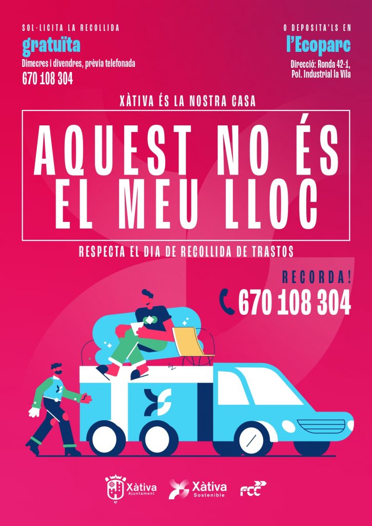 L’Ajuntament de Xàtiva, sota la marca Xàtiva Sostenible, implementa un nou procediment de recollida de residus voluminosos amb l’objectiu de fomentar la neteja i la salubritat als carrers de la ciutat. El servei facilita que l’usuari puga dipositar un moble, una nevera vella o un objecte voluminós al carrer, de manera controlada, i amb una cita prèvia concertada per a la seua recollida i de manera completament gratuïta. D’aquesta manera, es pretén acabar amb l’abandonament indiscriminat d’estris voluminosos com a mobles, matalassos o electrodomèstics en plena via pública.